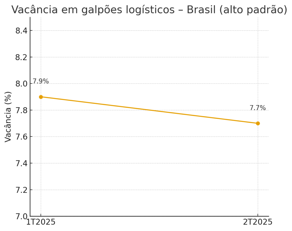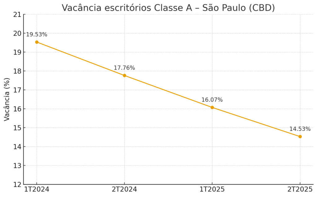 • Vacância e absorção: a queda estrutural de vacância em São Paulo (classe A) e a ocupação recorde em logística indicam demanda por ativos eficientes e bem localizados — reforçando viabilidade de repasses de aluguel quando o ativo entrega performance (Figura 2 e 3).