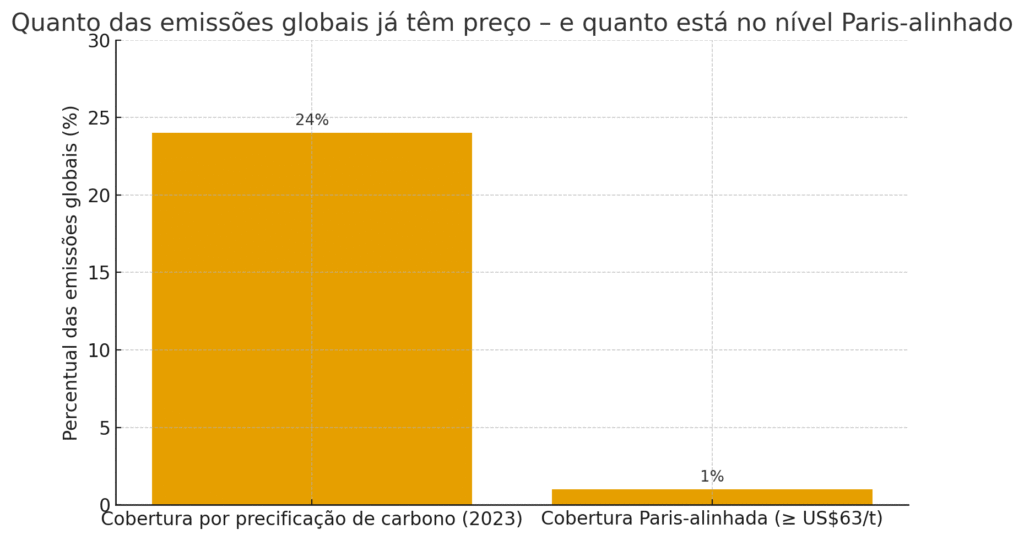 Observa-se aceleração do pricing de carbono em nível global: em 2024, instrumentos de precificação (ETS e tributos) cobriram cerca de 24% das emissões, porém menos de 1% das emissões está precificado no intervalo Paris-alinhado (US$ 63–127/t). Essa assimetria pressiona cadeias de valor intensivas em carbono e reduz a folga para brown assets. A literatura vem confirmando que eventos extremos e risco de inundação já repercutem sobre preços e retorno de ativos, com sinais de brown discount em diferentes mercados. Em paralelo, o Brasil aprovou a lei que institui o Sistema Brasileiro de Comércio de Emissões (SBCE), com desenho regulatório em implementação — vetor que tende a tornar explícito o custo de carbono nos business plans setoriais.
