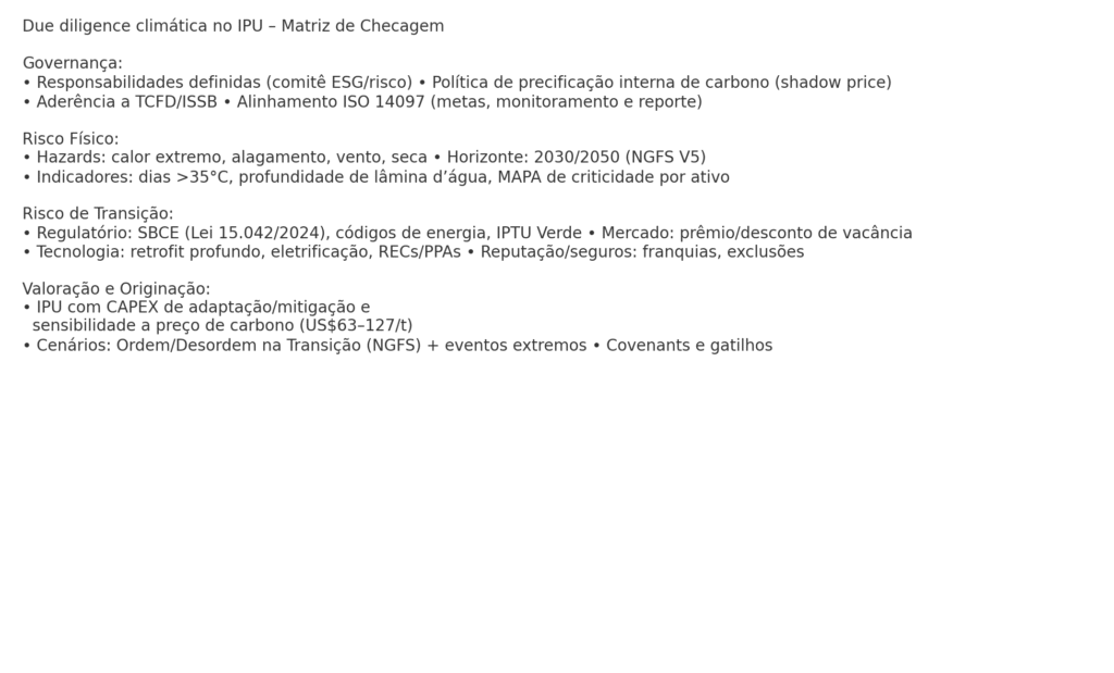 Due diligence climática: como integrar risco físico e transição ESG no IPU sem paralisar a originação” — governança, métricas e precificação de carbono