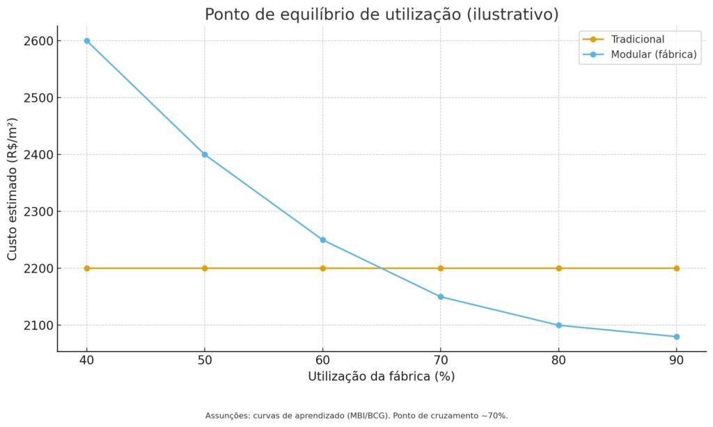 • Escala e repetição: a curva de aprendizado desloca o custo unitário conforme a utilização da fábrica. A simulação (Figura 4) indica breakeven próximo a 70% de utilização — coerente com literatura sobre off-site e dados setoriais. BCG+1