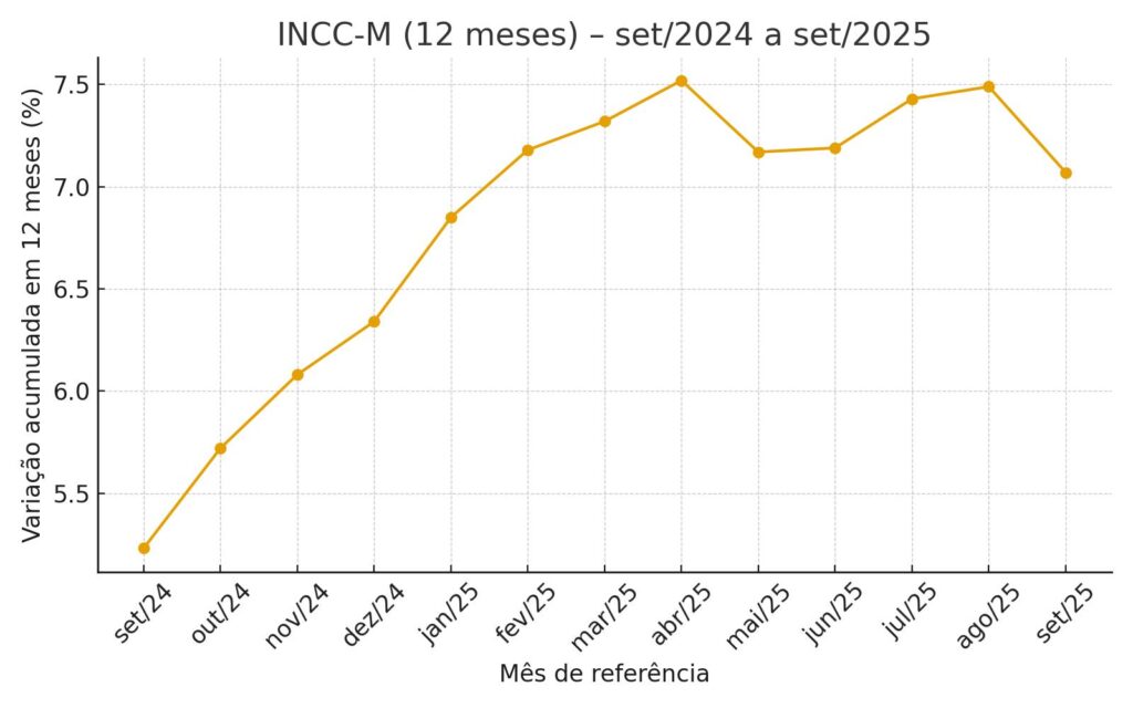 O INCC-M acumula 7,07% em 12 meses (set/2025), após aceleração ao longo de 2025, pressionando proformas, contingências e cronogramas de obra, especialmente em estruturas de pré-lançamento indexadas. Portal FGV+2IBRE+2