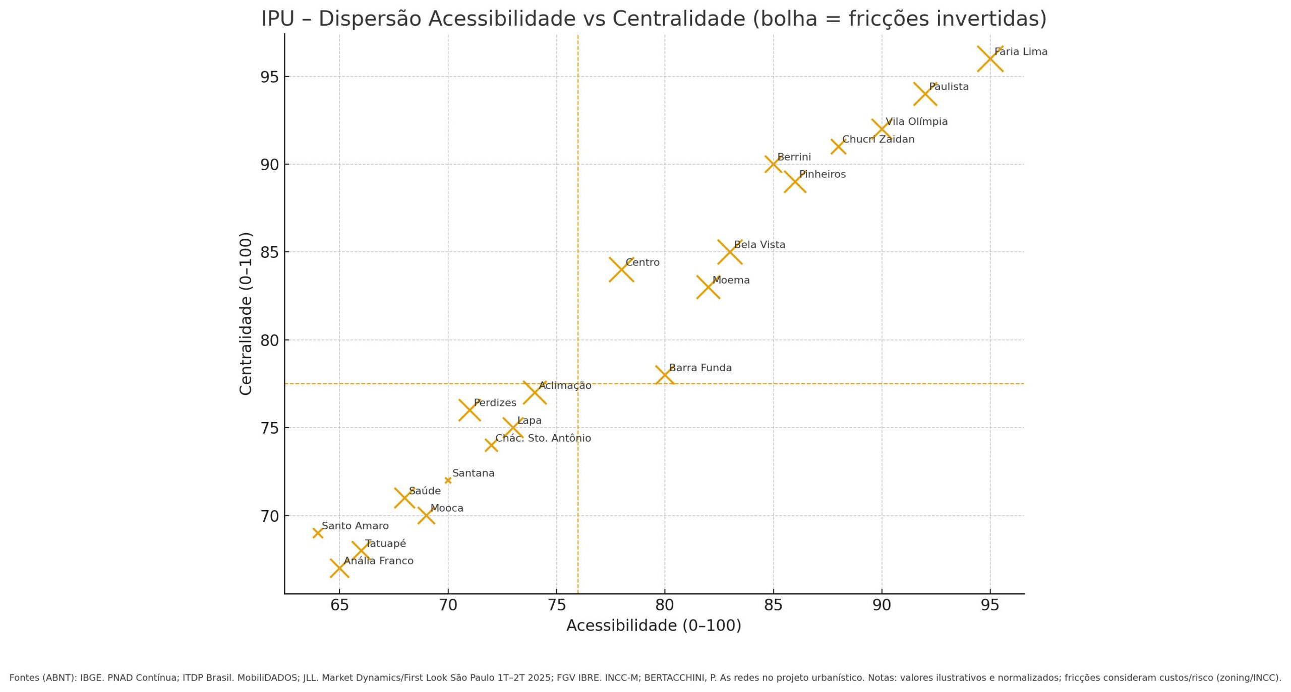 Normalização e pesos. Variáveis são reescaladas (z-score ou min–max); subescores combinam-se por pesos (40/40/20). O IPU pode ser calibrado por classe de produto (MCMV, médio, alto padrão, locação multifamily) e tese de investimento (desenvolver, comprar–construir–operar, landhold). (Observação: pesos e proxies podem variar conforme cidade/organização.)