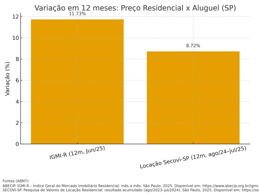 A fotografia residencial aponta um contraste: preços de venda subiram 11,73% no acumulado de 12 meses até junho/2025 (IGMI-R), enquanto o aluguel residencial em São Paulo avançou 8,72% no acumulado até julho/2024, sinalizando spread de precificação e oportunidade para ativos build-to-rent bem calibrados em tipologias e serviços. Abecip+1