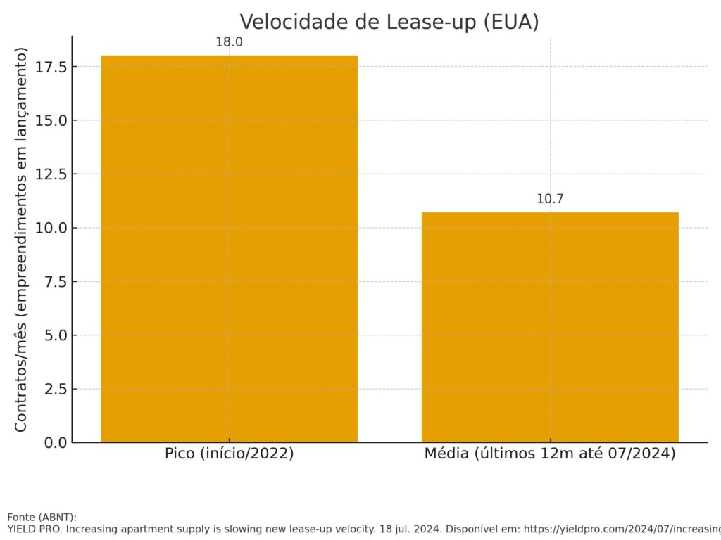 No ciclo internacional recente, a velocidade média de lease-up em multifamily desacelerou com o aumento de oferta, caindo de 18 contratos/mês (pico no início de 2022) para 10,7 contratos/mês em 2024 — reforçando que diferenciação de produto e microsegmentação de demanda são condições para compressão de prazos. Yield PRO